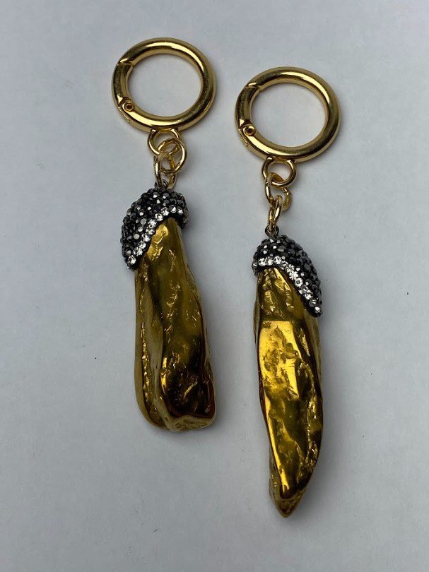 Imponente e cheio de personalidade, este brinco traz um pingente em formato orgânico dourado, contrastando com a aplicação de cristais escuros que envolvem o topo da peça. A combinação entre brilho, textura e formato irregular cria um visual poderoso e sofisticado ao mesmo tempo.